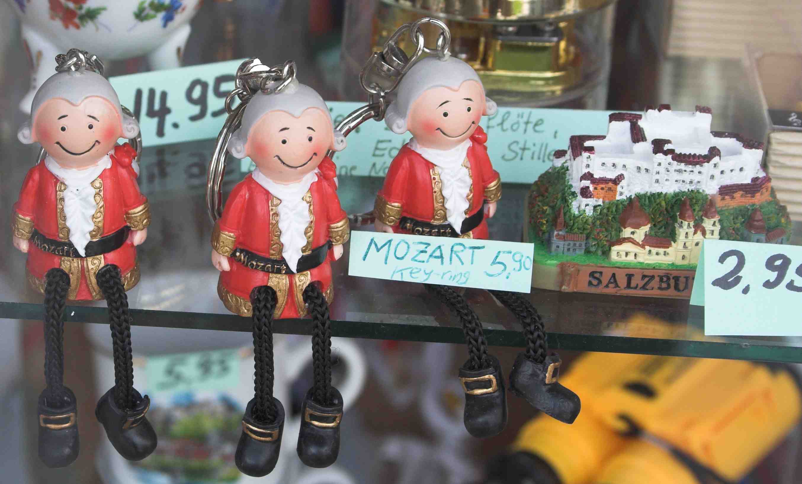 Kretynizmy mozartowskie – zapowiedziany ciąg dalszy. Oto nie tylko piekne, ale i bardzo praktyczne przywieszki do kluczy. I do tego wcale nie drogie – jedyne 5,90 Euro! Proszę też łaskawie zwrócić uwagę na pikantny szczególik: Na pasku jest napisane „Mozart”. Dwa z tego płyną wnioski. Po pierwsze, że wcale nie jest oczywiste, kogo ten ludzik wyobraża. Po drugie zaś, że jest to bardzo zmyślnie wykoncypowane – wystarczy tylko zmienić ten napis i można te przywieszki sprzedawać jako „Salieri”, czy co tam jeszcze. Bardzo praktyczne były jednak te stylowe peruki. A nawiasem mówiąc była to moda wymuszona przez szalejące wówczas, powodujące łysienie, choroby weneryczne przywleczone przez Kolumba z Ameryki. No, ale to tylko dygresja i wracamy do kontemplacji wisiorków. Choć robią one wielkie i niezapomniane wrażenie, subtelny esteta nie pominie także pięknej, gipsowej makiety zamku w Salzburgu (za jedyne 2,99, a radości jak za stówę, co najmniej!).